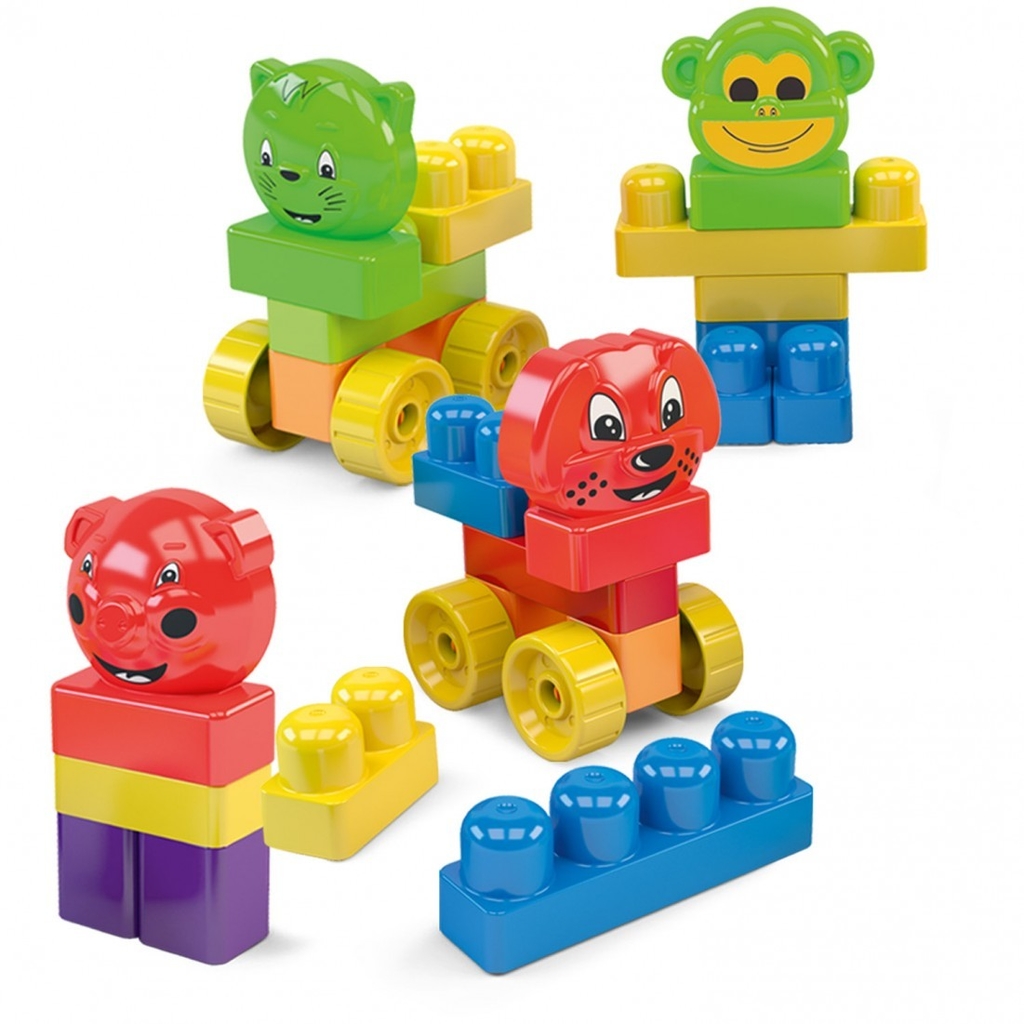 Contém: 1 casinha, 1 telhado de encaixe, 4 copos, 1 rostinho e 3 formas geométricas. Acompanha cartela de adesivos.Contém: 1 cadeira, 1 forma de gato, 1 forma de cachorro, 1 forma de palhaço, 1 forma de porco, 5 pinos triplos, 5 pinos simples, 4 pinos com rodas, 2 pinos quádruplos e 8 pinos duplos.