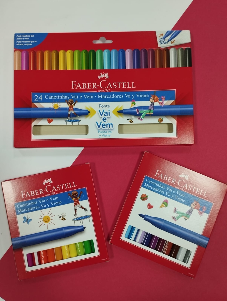 As canetinhas hidrográficas Faber-Castell estimulam a criatividade das crianças com a formulação exclusiva de corantes de alta qualidade com cores mais vivas. As canetinhas tem ponta média com a tecnologia exclusiva da ponta Vai e Vem: sistema de amortecimento contra impactos, garantindo maior resistência e durabilidade. A tinta é lavável e o produto é atóxico.