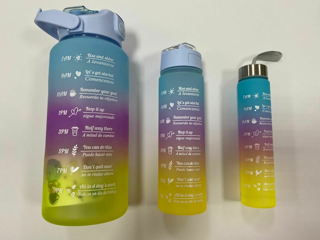 03 Garrafas Coloridas com Frases e Horários, ideal para acompanhar você para onde precisar e manter a hidratação em dia.