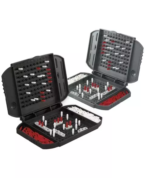 Jogabilidade clássica em formato de bolso. Este jogo pode ser levado para jogar onde quiser. Esta versão usa as mesmas regras do jogo Battleship original. O jogador deve afundar a frota de 5 navios do inimigo antes que ele afunde a sua. O jogadores deve posicionar todas as suas unidades navais estrategicamente e tentar fazer lançamentos precisos contar a frota do inimigo. Para crianças a partir dos 7 anos. O jogo Battleship Grab & Go para 2 jogadores é uma excelente opção para passar o tempo em viagem de avião, comboio ou carro, além de acampamentos e férias. É fácil de preparar e de guardar. Depois do jogo, basta guardar as peças nos estojos. Quem comandará os oceanos do jogo Battleship Grab and Go?