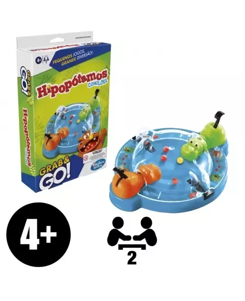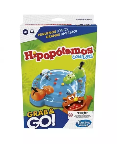 Nham, nham! Os hipopótamos estão famintos. Diversão em qualquer lugar com o jogo Grab and Go Hipopótamos Comilões portátil que usa as mesmas regras da versão original. Feito para 2 jogadores, este jogo inclui 2 hipopótamos e várias bolinhas. A capa de plástico evita que as bolinhas caiam. Assim, o jogo pode ser levado para qualquer lugar. Excelente jogo para crianças a partir dos 4 anos. Ideal para levar em viagens, acampamentos ou noite de jogos fora de casa.